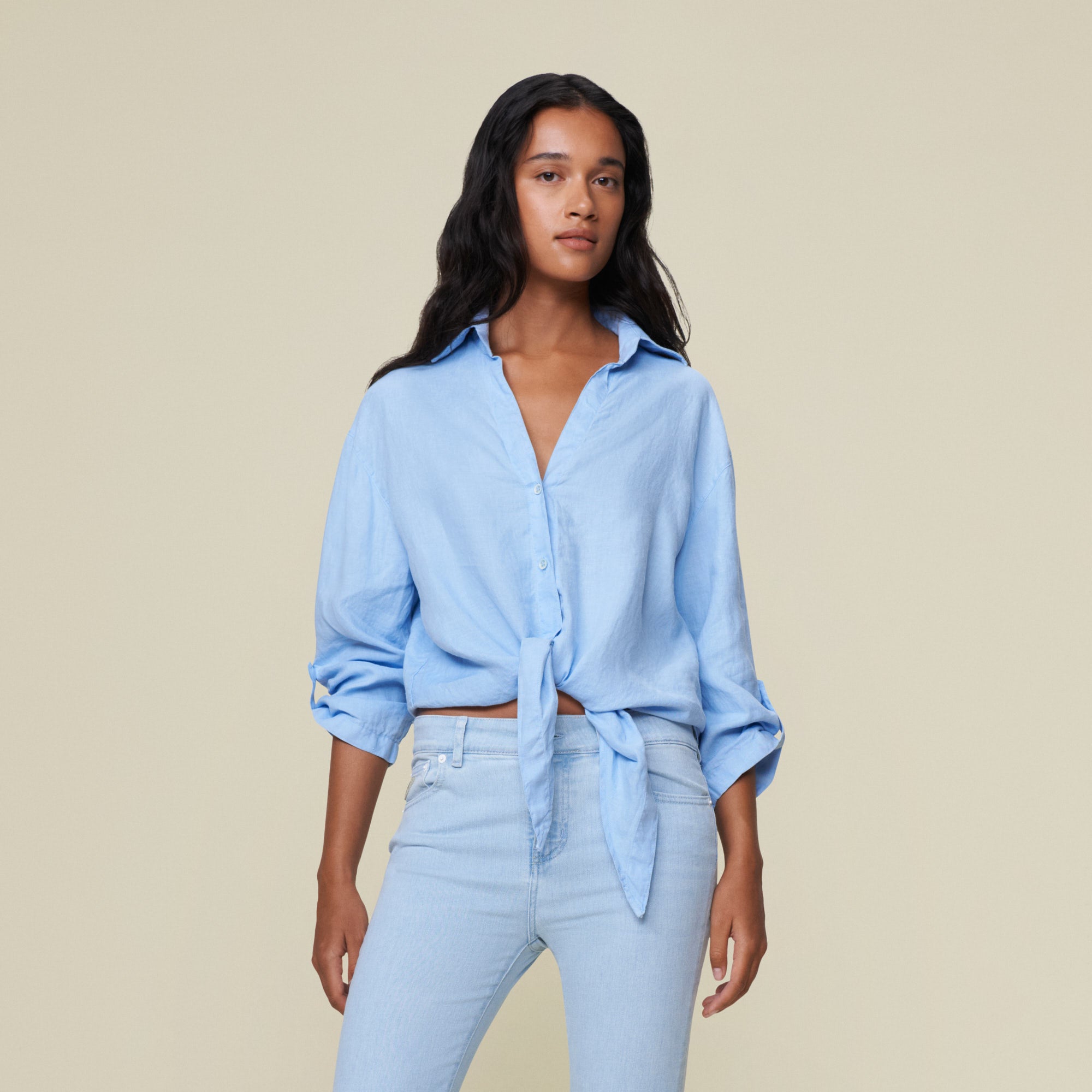 The Pia is our knotted shirt with button -tab sleeves.